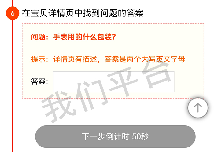 3、可以设置在详情页找答案功能,促使买家深度浏览你的商品,能非常有效的防止秒拍,不过答案要具有唯一标准性,否则买家可能无法答对而完成不了任务